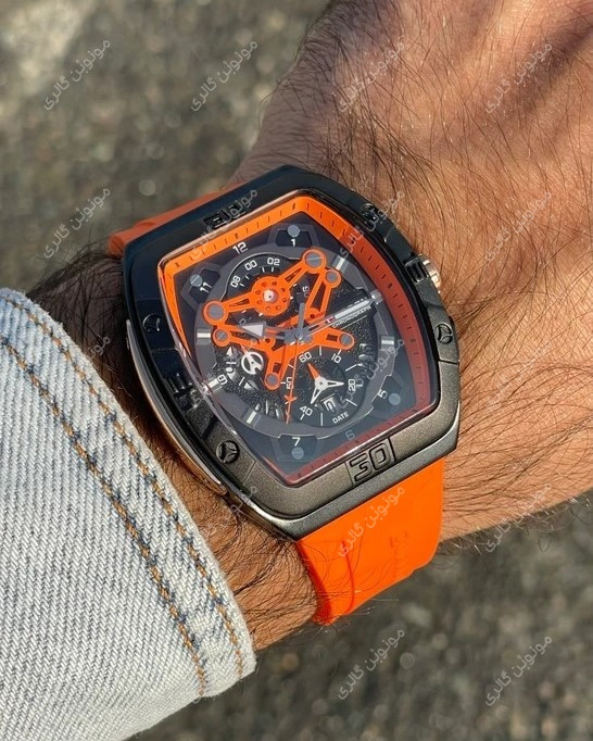 صفحه این ساعت مچی مردانه با طراحی اسپرت و مدرن، دارای زمینه نارنجی با عقربههای نقرهای و مشکی است که خوانایی بالایی را فراهم میکند. نمایشگرهای فرعی عملکردی، به صورت متقارن در صفحه قرار گرفتهاند و جلوهای حرفهای به ساعت بخشیدهاند. قاب فلزی با پرداخت مات، حس لوکس و باکلاس بودن را منتقل میکند و بند سیلیکونی نارنجی، جلوهای پرانرژی و خاص به استایل شما میبخشد.